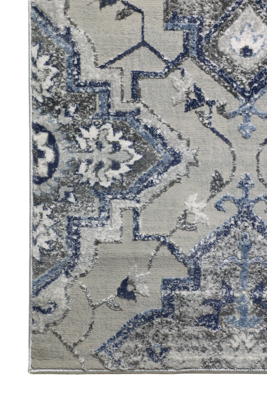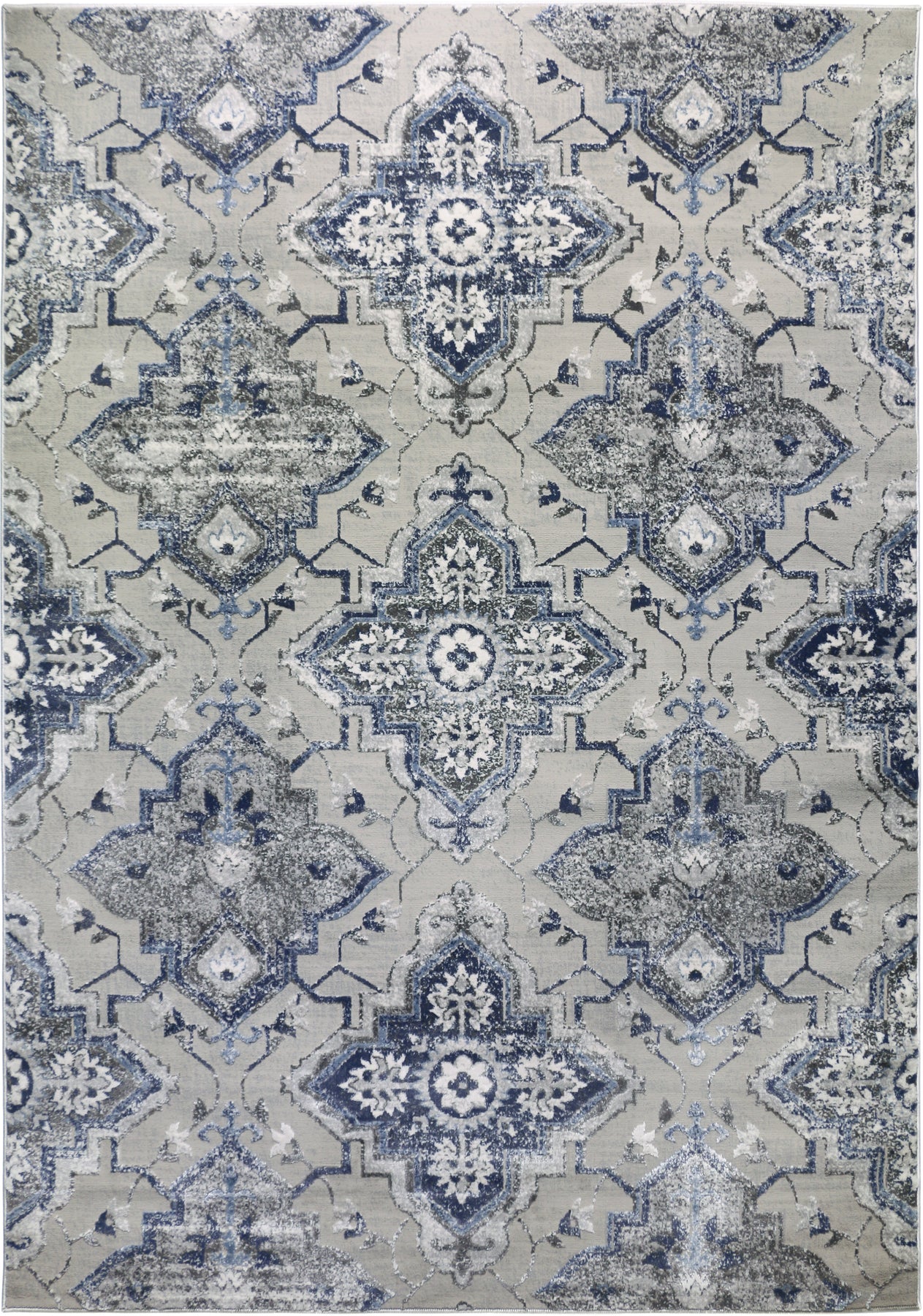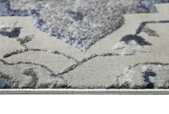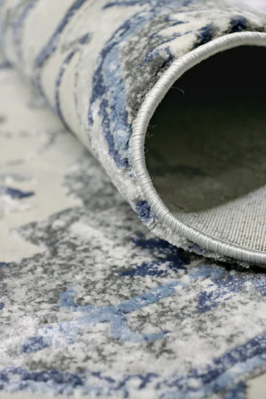 Colours found in this Bogota area rug include cream, taupe, arctic blues, red/orange and soft golds.