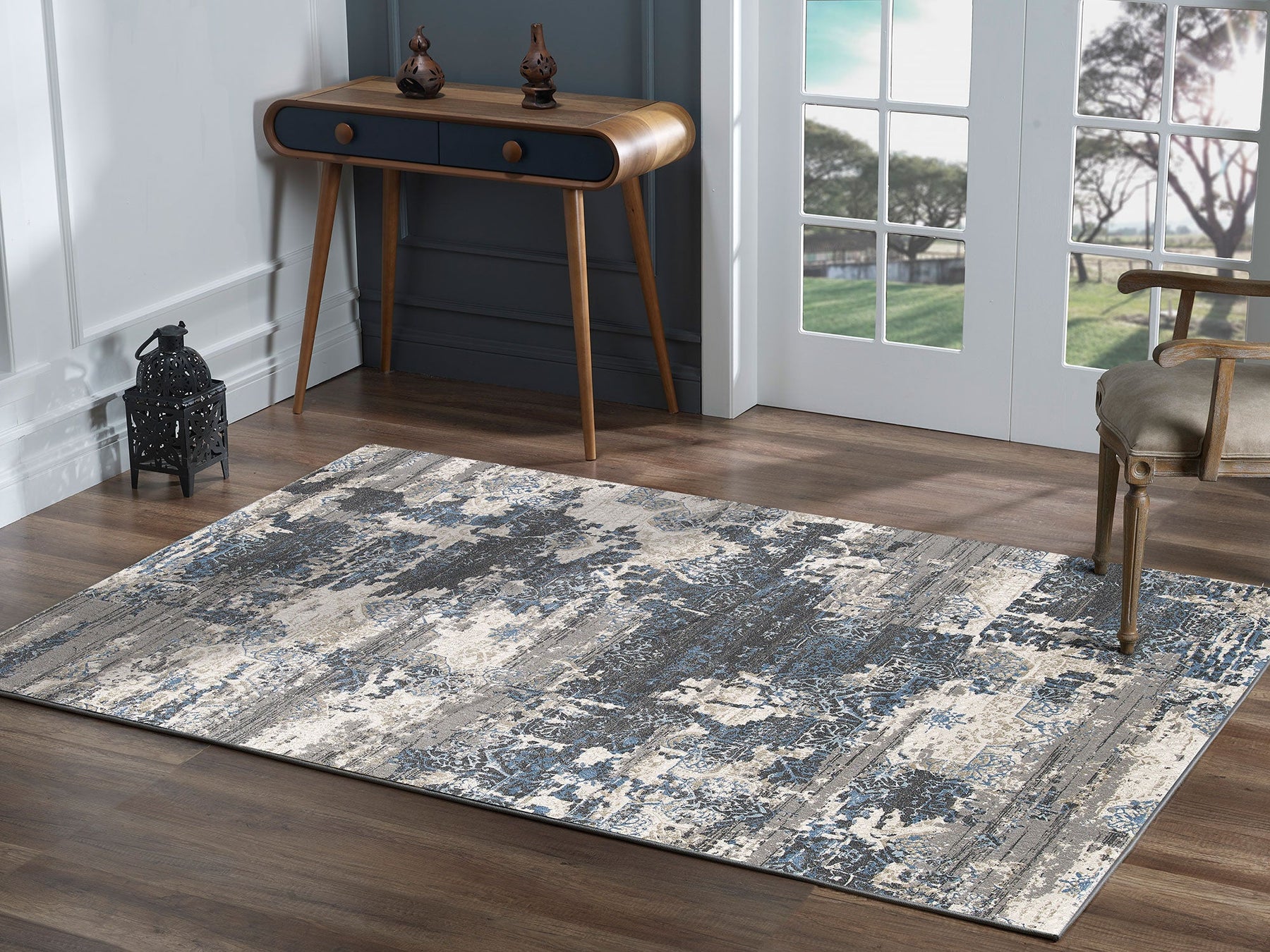 Regular price $100.00USD Save $-100.00USDThis design is one of the darker palettes from the Ginza Collection, with medium grey and deep charcoal tones layered in with a striking blue and cream medallions. This rug will add interest and dimension with an elegant polished finish to complete any space.Â