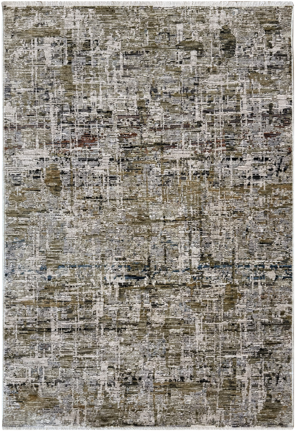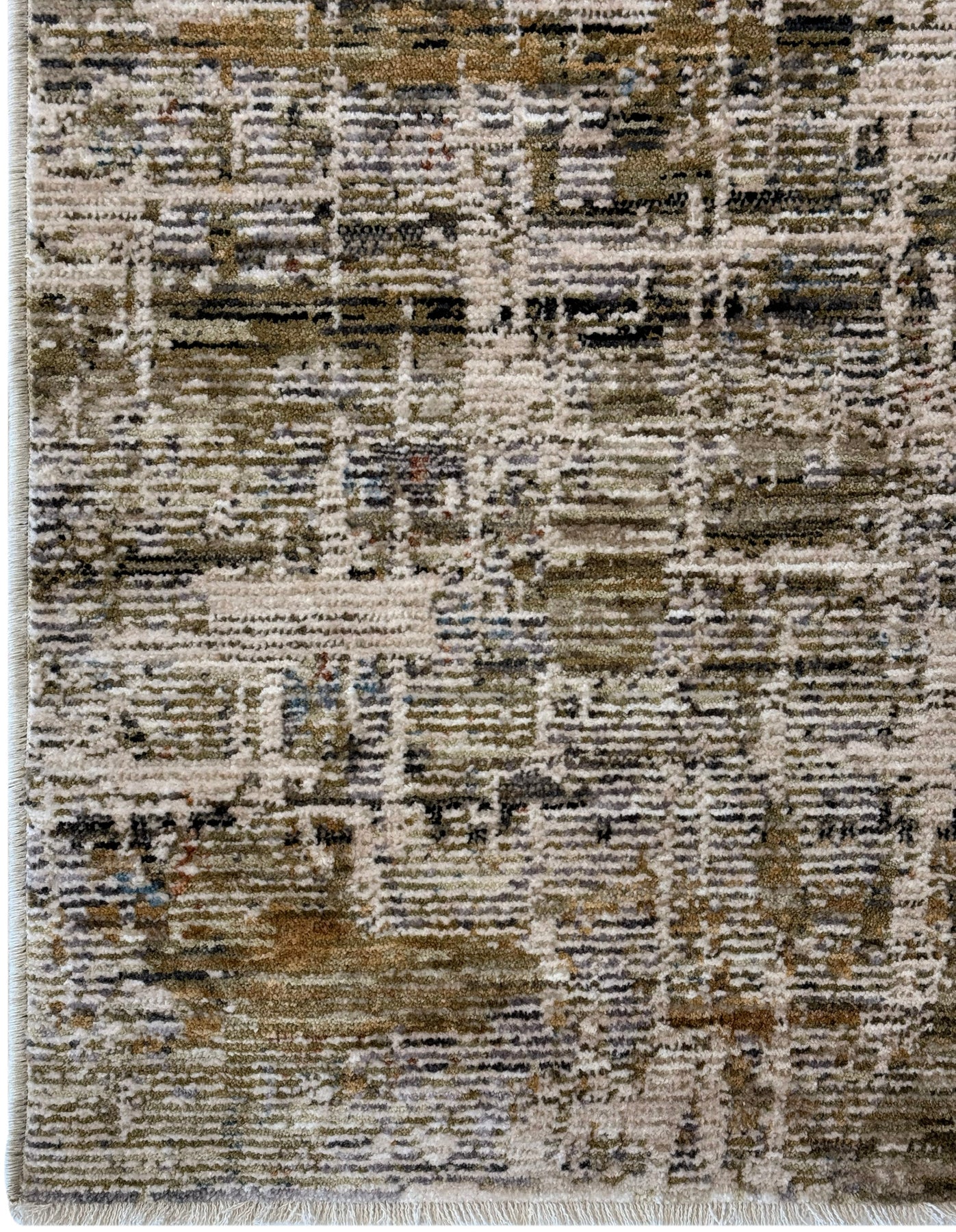 The Kendal–Iris 3346 Beige Green rug blends warm beige, soft ivory, olive green, charcoal, and muted taupe in a refined abstract grid design. The pattern feels layered and architectural, with horizontal and vertical striations creating a woven, textural effect that adds movement without overwhelming the space.