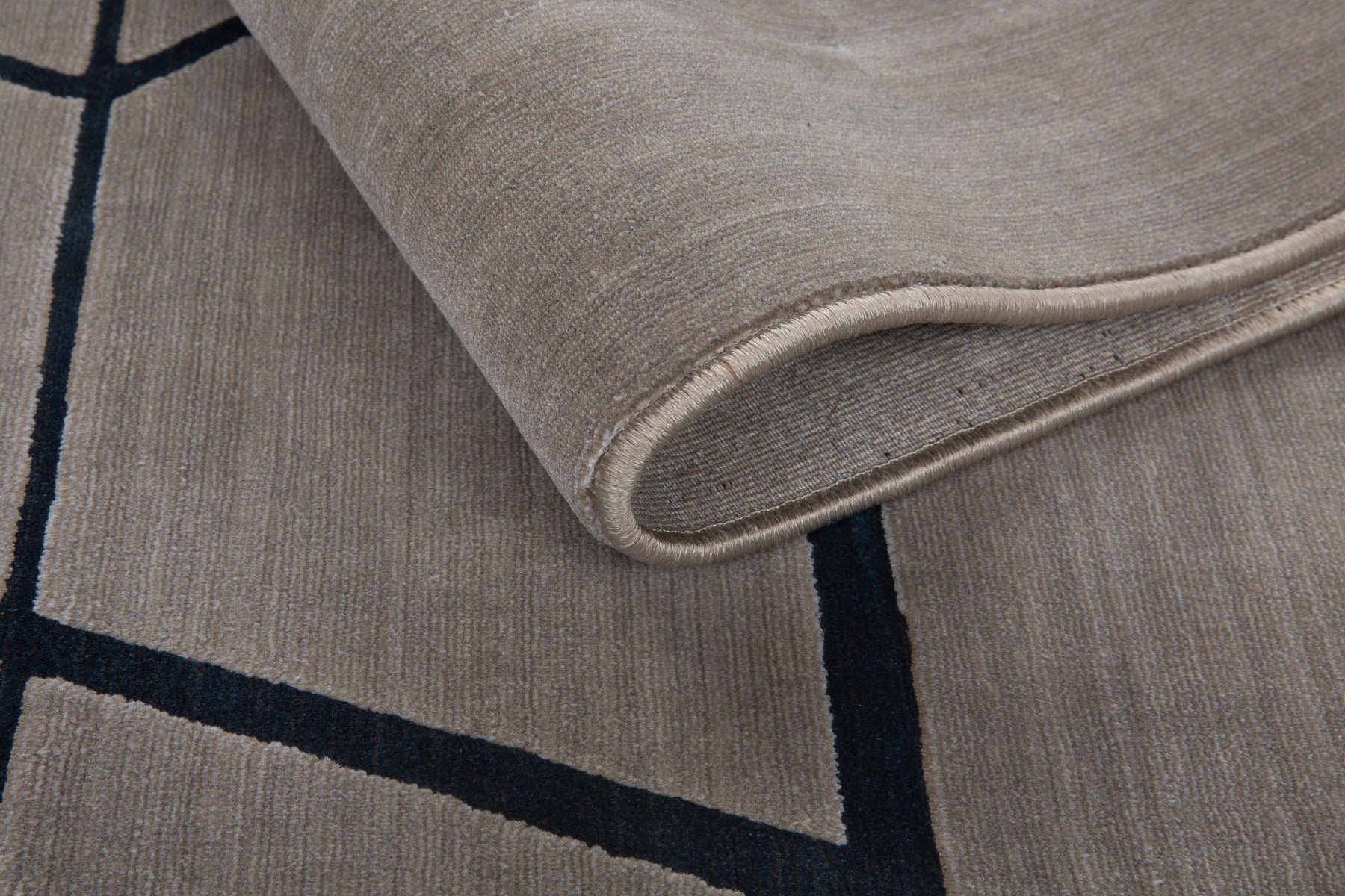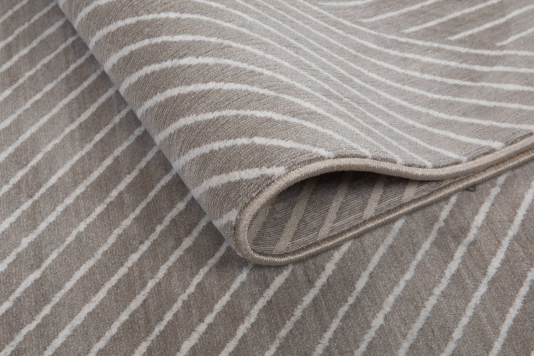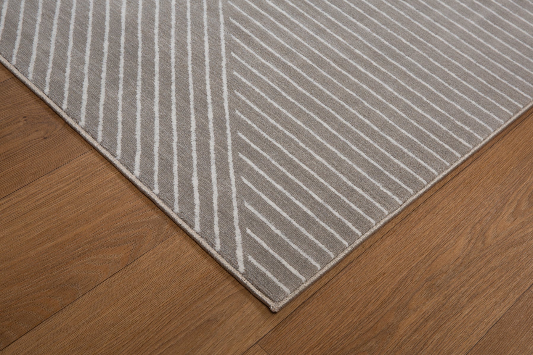 Against a warm taupe background, the crisp white lines add a touch of contrast, infusing the rug with a sense of contemporary flair. The diagonal orientation of the lines is thoughtfully designed to create a harmonious balance, with one half intersecting the other, resulting in a visually engaging and aesthetically pleasing composition.