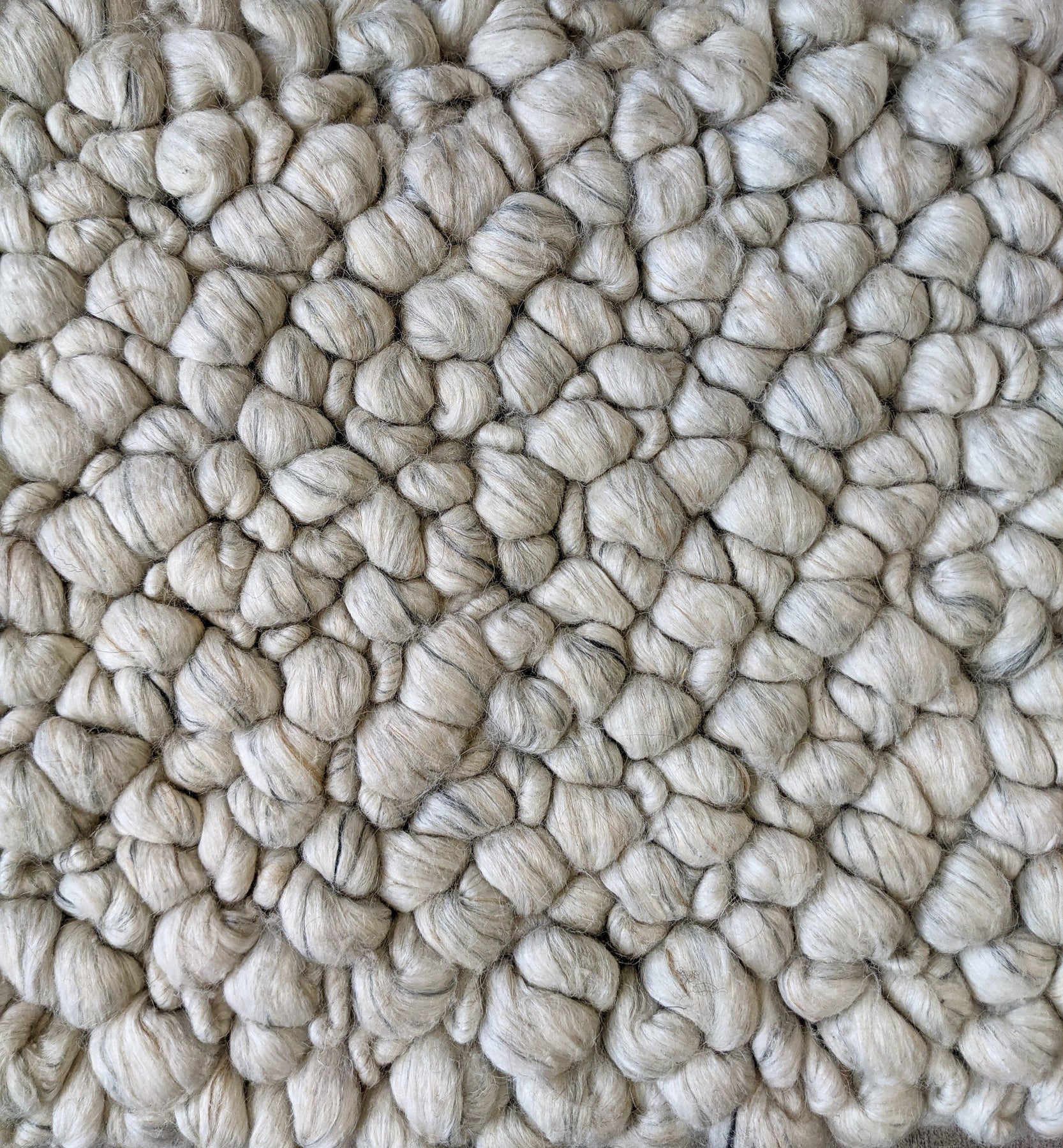 Regular price $1,238.00USD Save $-1,238.00USDThis textured area rug is beautifully handmade with 50% wool and 50% viscose. The backing is 100% cotton. This area rug is masterfully looped individually in various sizes giving the rug a stone like appeal. The blending of the wool and viscose brings in different shades and textures in its color pallet. This rug is sure to bring in conversation with its unique look and minimalistic appeal.