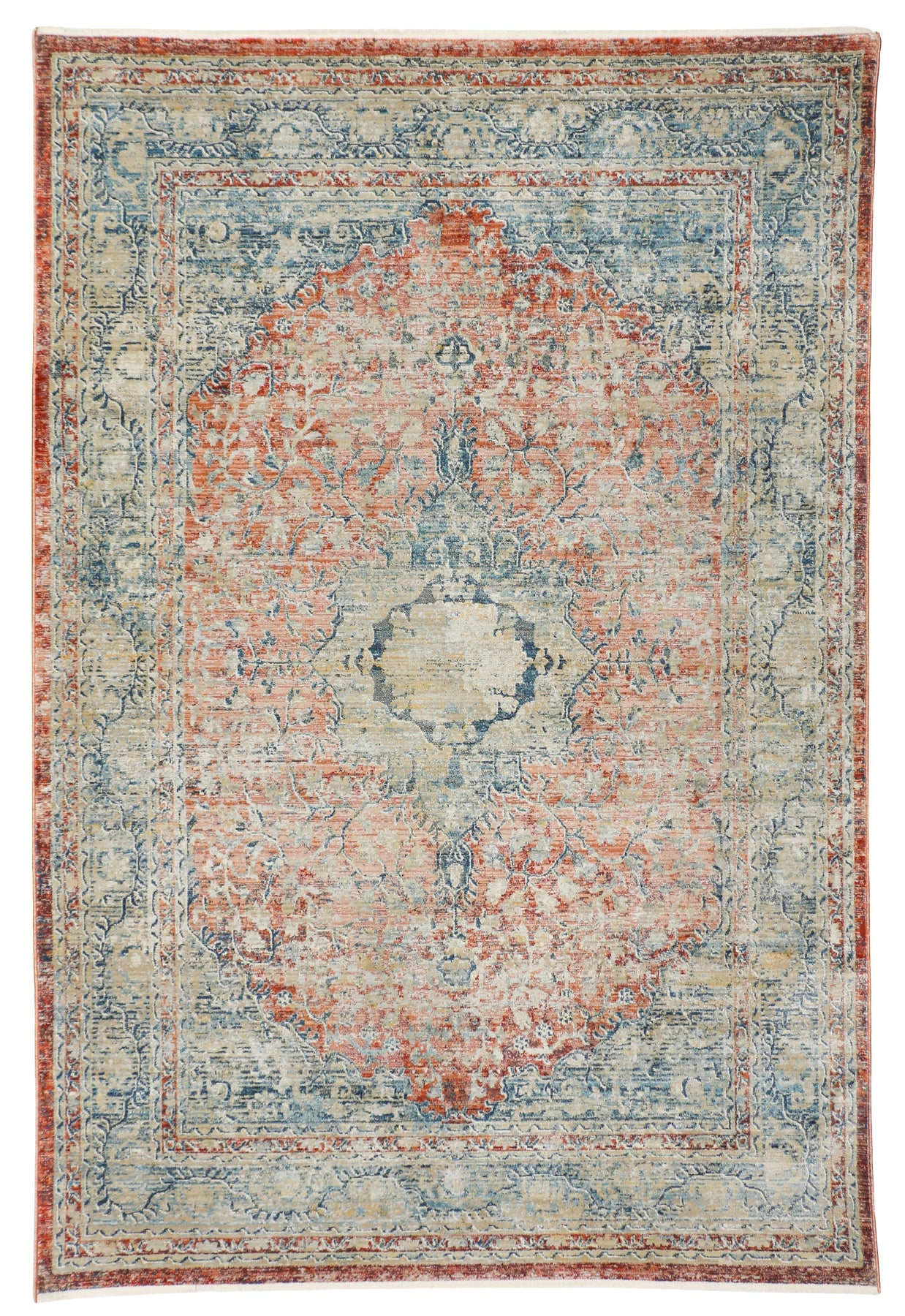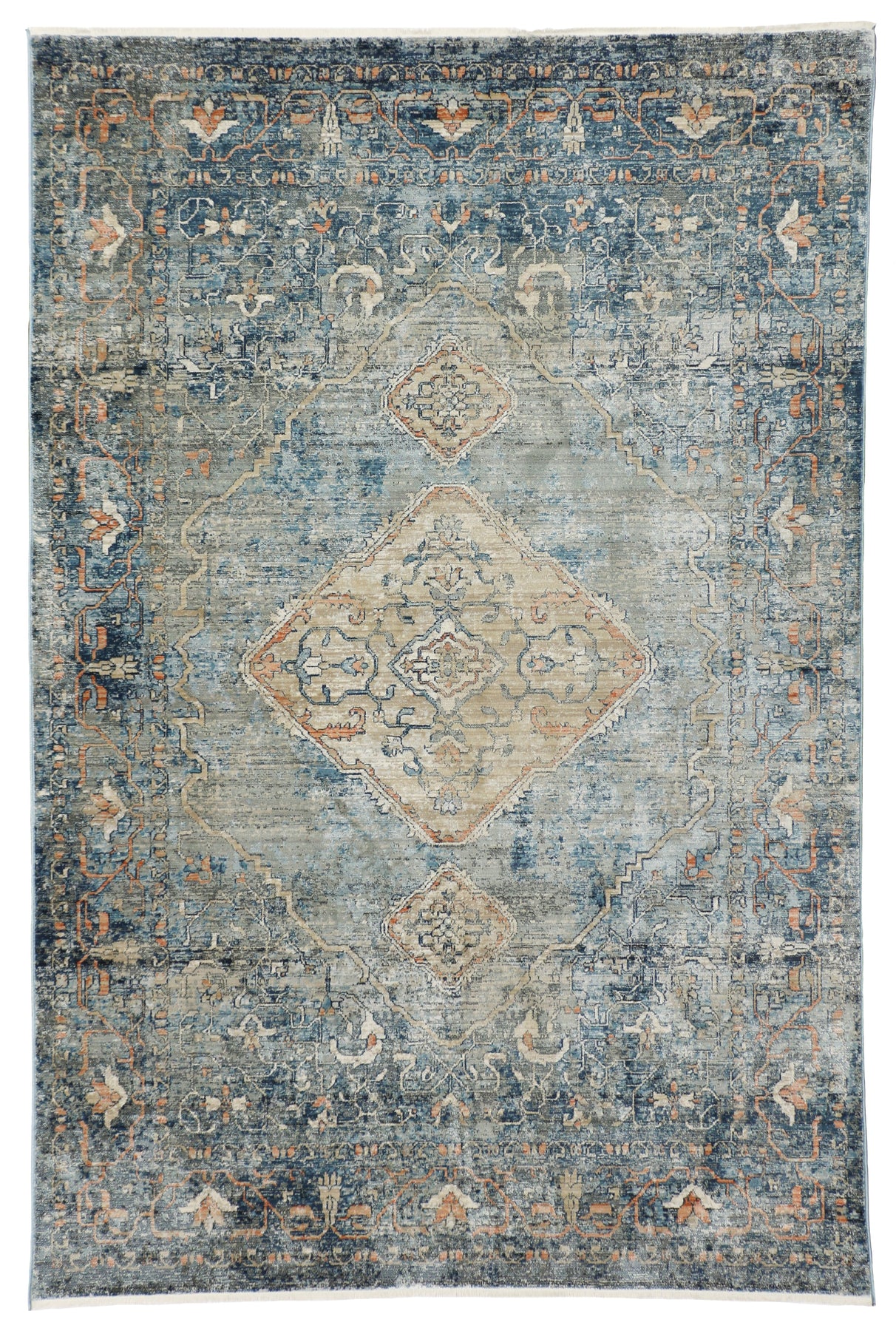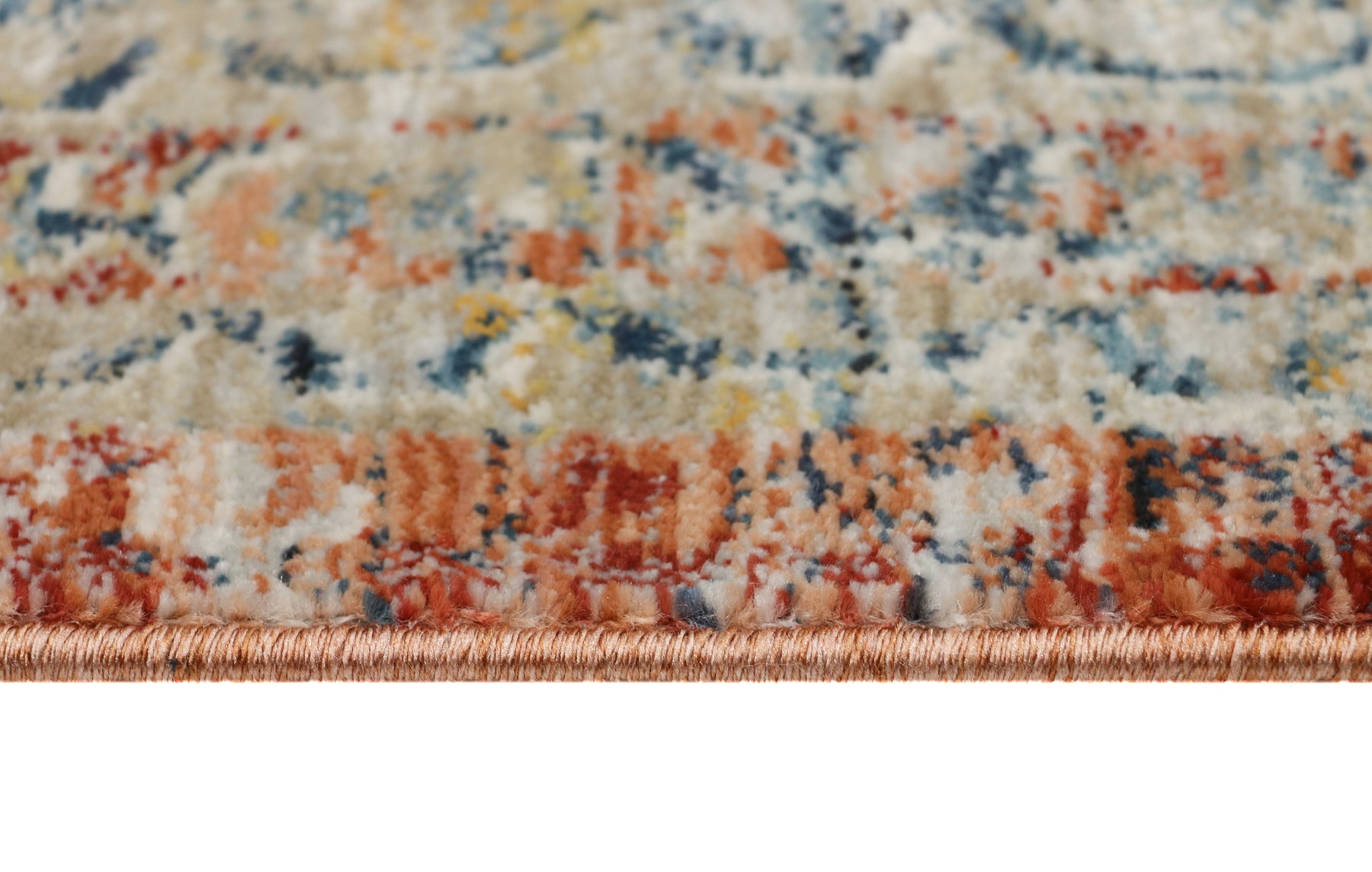 Colours found in this Bogota area rug include blues, soft gold, red/orange, taupe and cream.