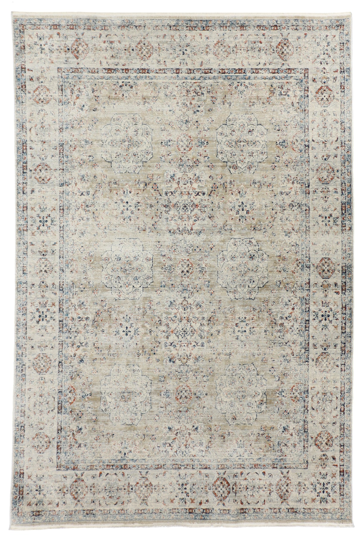 Colours found in this Bogota area rug include taupe, blues, soft gold, red/orange and cream.