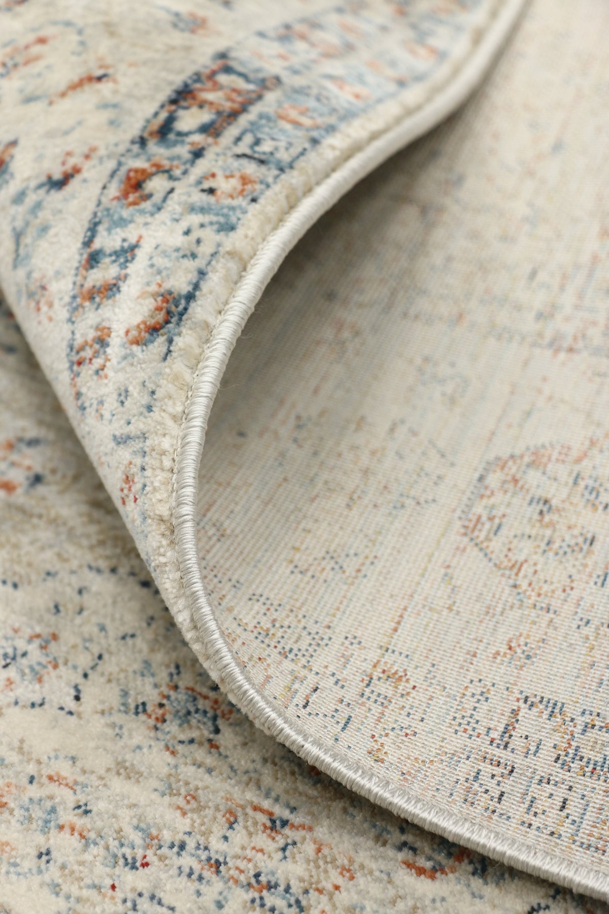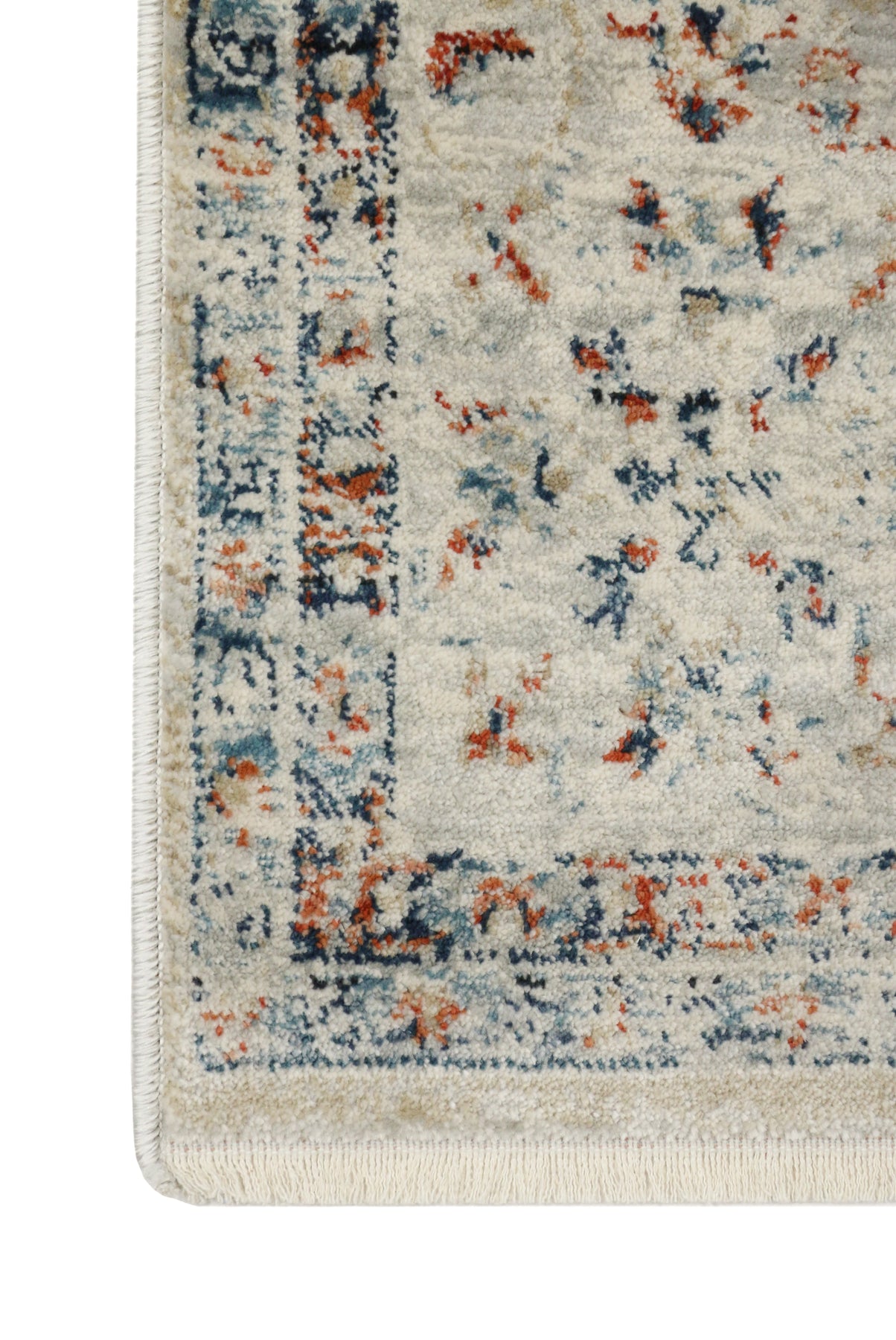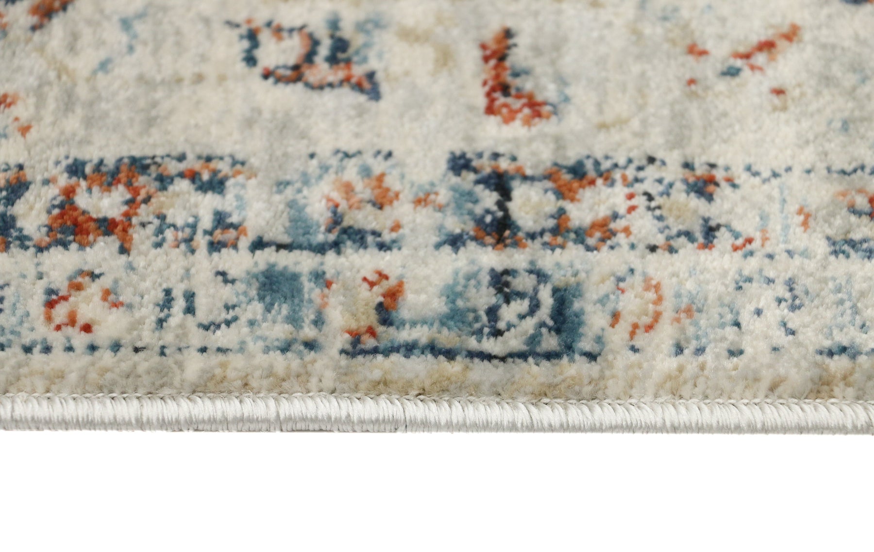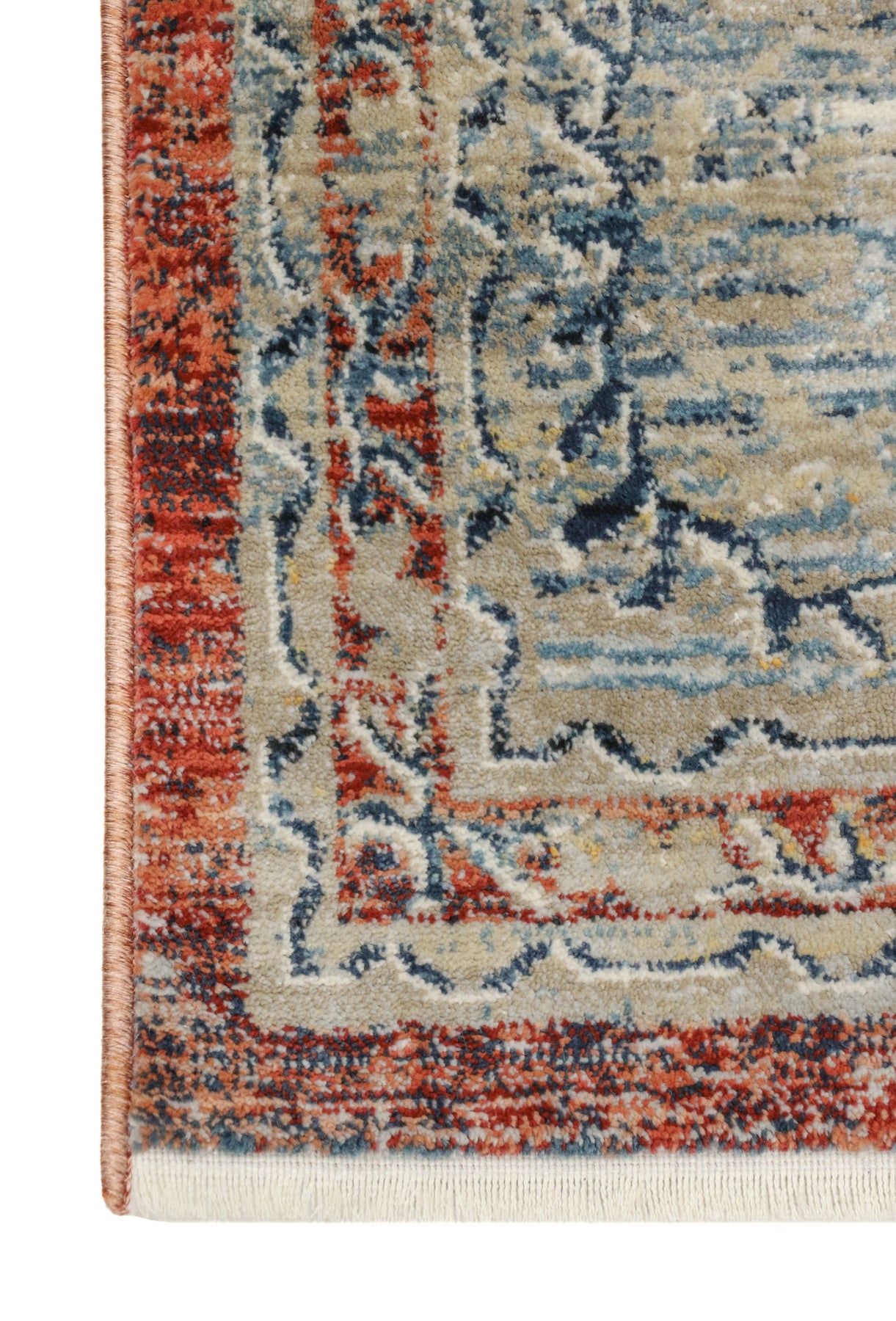 Colours found in this Bogota area rug include cream, taupe, arctic blues, red/orange and soft golds.