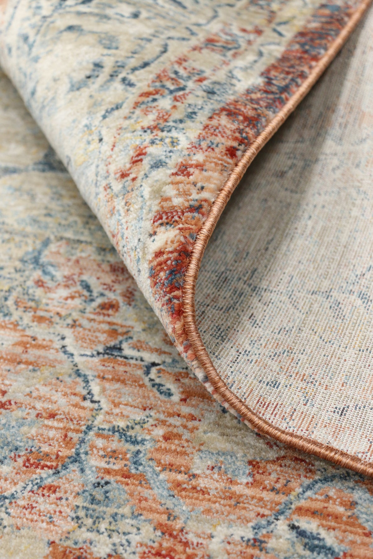 Colours found in this Bogota area rug include arctic blues, burnt oranges, tile red, soft golds, beiges & creams.