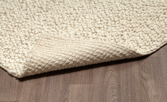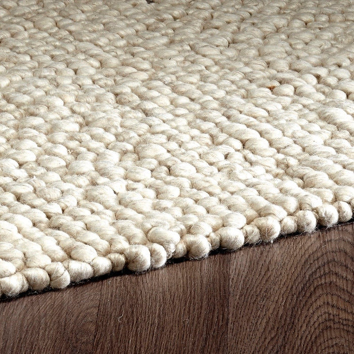 This textured area rug is beautifully handmade with a backing of 100% cotton. This area rug is masterfully looped individually in various sizes giving the rug a stone like appeal. The blending of the wool and viscose brings in different shades and textures in its colour pallet. This rug is sure to bring in conversation with its unique look and minimalistic appeal.